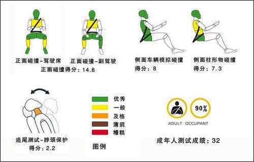 昊銳在正面碰撞中對駕駛員與乘客的胸部保護一般,頭部和盆骨保護最好,駕駛員小腿可能受踏板變形有所傷害。在側(cè)面模擬車體碰撞試驗中,昊銳對駕駛員保護良好獲得滿分,但柱體碰撞中對胸部保護不過。對于頸部保護試驗,昊銳只獲得了邊緣成績,對于頭枕的設(shè)計有改良空間。最終對成人保護得分率為90%