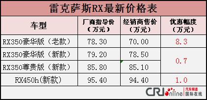 新款RX350分別為豪華版和尊貴版兩款車型,近期購買RX350新款的消費(fèi)者可以得到7000元的優(yōu)惠。銷售人員還介紹,剛剛上市的RX450h車型貨源相對比較緊張,所以只有1萬元的優(yōu)惠,而且目前還有老款RX350的庫存車,優(yōu)惠幅度較大,達(dá)到了8.3萬元,售價(jià)達(dá)到70萬元。詳細(xì)優(yōu)惠信息如下: