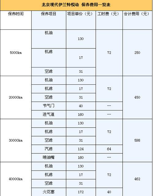 悅動的首保為5000km,以后每次的保養(yǎng)間隔為5000km。保修政策為2年/6萬公里保修(以先到為準(zhǔn))。第二次的10000km保養(yǎng)和首保內(nèi)容相同。那么如果一年行駛2萬km,悅動一年要做四次保養(yǎng)。由下表可知其除了第一年,以后每年的保養(yǎng)費(fèi)用1500元。