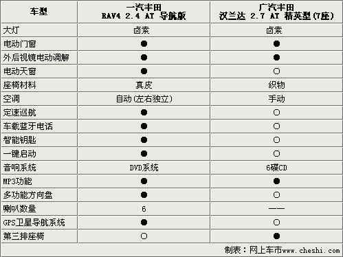 一汽豐田RAV4 2.4自動導航版和廣汽豐田漢蘭達2.7精英型7座的舒適配置相差比較懸殊。RAV4 2.4自動導航版屬于RAV4車系中的頂配車型,舒適配置可謂是應有盡有,電動天窗、真皮座椅、自動空調(diào)、定速巡航、多功能方向盤、DVD影音系統(tǒng)等設備都成為了標準配置。而漢蘭達2.7精英型7座屬于該車系中的低配車型,在舒適配置方面盡顯于基本使用。但在空間利用上漢蘭達還是比較具有優(yōu)勢的,首先漢蘭達最多可以承載7名乘客,而且室內(nèi)空間可以靈活多變,放倒比例達到了4:2:4,可以更加有效的方便乘客置放大件物品。