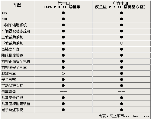 從上表我們可以看到,在電子主動安全系統(tǒng)的配備中,ABS+EBD、動態(tài)穩(wěn)定系統(tǒng)和6安全氣囊均成為了一汽豐田RAV4 2.4自動導航版和廣汽豐田漢蘭達2.7精英型7座的標準配置。但仔細看下來它們還是略有不同。豐田RAV4再配備了上坡輔助系統(tǒng)的同時,還配備下坡輔助系統(tǒng),確保車輛在斜坡上能以穩(wěn)定速度的行駛。而漢蘭達則是配備了膝部氣囊,可以有效的降低事故發(fā)生后對乘客的傷害。比較遺憾的是這兩款車型均沒有配備倒車輔助系統(tǒng)。