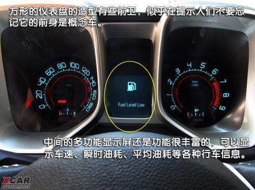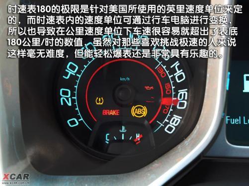 方形的儀表盤的造型有些前衛(wèi),似乎在提示人們不要忘記它的前身是概念車。中間的多功能顯示屏還是功能很豐富的,可以顯示車速、瞬時油耗、平均油耗等各種行車信息。在右側(cè)紅區(qū)表底9000轉(zhuǎn)的轉(zhuǎn)速表內(nèi),可以看到SS的小logo。左邊的時速表實在有些不夠讓人心動,為什么這么說呢,因為時速表的表底數(shù)值為180,難道Camaro SS這么強大超級跑車最高時速只能達(dá)到180公里/時,不是之前官方說288公里/時嗎?據(jù)工作人員介紹,180的極限數(shù)值是針對美國所使用的英里速度單位來定的,而時速表內(nèi)的速度單位可通過行車電腦進(jìn)行變換,所以也導(dǎo)致Camaro SS在公里/時的速度單位下,很容易就超出表底180的最高車速,雖然對于那些喜歡挑戰(zhàn)極速的人來說180公里/時實在是毫無難度,但能夠如此輕松爆表還是非常具有樂趣的。