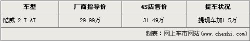據(jù)4S店銷(xiāo)售人員介紹,在售的道奇酷威為2.7L自動(dòng)檔車(chē)型,售價(jià)為29.9萬(wàn)元。近期購(gòu)買(mǎi)酷威的消費(fèi)者如要在經(jīng)銷(xiāo)店提現(xiàn)車(chē),需在廠商指導(dǎo)價(jià)29.99萬(wàn)元的基礎(chǔ)上加價(jià)1.5萬(wàn)元才可提車(chē),加價(jià)后的價(jià)格增長(zhǎng)為31.49萬(wàn)元。銷(xiāo)售人員還介紹,店內(nèi)只有一輛酷威銀色現(xiàn)車(chē)。