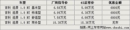 據(jù)吉利汽車4S店銷售人員介紹,吉利遠景目前商務(wù)型仍然沒有現(xiàn)車,其他車型的貨源比較充足,而且有6000元的優(yōu)惠。另外,消費者到店購車還可以贈送裝飾。啟用吉利全新車標(biāo)的EC718將很快上市,在車型配置以及車型級別將高于現(xiàn)款遠景,預(yù)計價格也將高于現(xiàn)款遠景。
