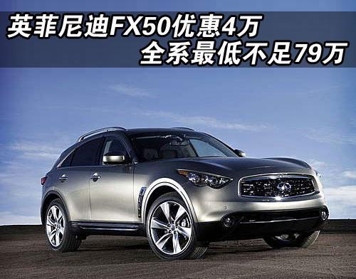 據(jù)英菲尼迪4s店銷售人員介紹,目前店內(nèi)銷售的FX系列有FX50和09款FX35兩款車型。英菲尼迪FX50近期出現(xiàn)了首次優(yōu)惠,降幅為4萬元,經(jīng)優(yōu)惠后售價從119.5萬元降到了115.5萬元。并且09新款的FX35超越版車型有2萬元優(yōu)惠,售價也降到了78.8萬元。