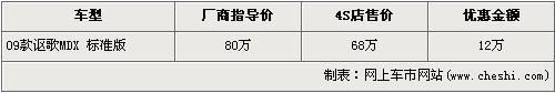 據(jù)經(jīng)銷商銷售人員介紹,09款謳歌-MDX的現(xiàn)金優(yōu)惠12萬(wàn)元,優(yōu)惠后售價(jià)也從原廠商售價(jià)80萬(wàn)降到了68萬(wàn),首次跌破了70萬(wàn)元。銷售人員還介紹,09款謳歌MDX增加的實(shí)用性的配件包括前下護(hù)板和后下護(hù)板,能避免惡劣路況對(duì)底盤帶來(lái)的損傷,并且09款謳歌MDX還新增了巴厘海藍(lán)和摩卡褐金兩種顏色,店內(nèi)現(xiàn)車非常充足,顏色也比較全,欲購(gòu)買者挑選的空間非常大。