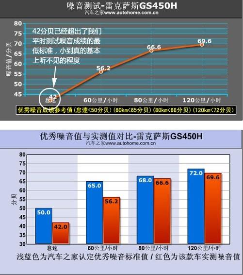咱們?cè)賮?lái)說(shuō)說(shuō)GS450h的噪音環(huán)節(jié),怠速狀態(tài)下這款車的噪音值為42分貝,這個(gè)成績(jī)已經(jīng)比標(biāo)準(zhǔn)低了很多很多,實(shí)際坐在車內(nèi)基本上什么也聽不到,測(cè)試儀測(cè)出的這42分貝的聲音應(yīng)該是屬于人耳很難聽到的那種音頻。行駛中的噪音也非常理想,60km/h、80km/h、120km/h時(shí)速下的噪音成績(jī)分別為56.2分貝、66.6分貝、69.6分貝;靹(dòng)車型最大的好處就在于它可以再任何適當(dāng)?shù)臅r(shí)候?qū)⑵桶l(fā)動(dòng)機(jī)關(guān)閉,只靠電動(dòng)機(jī)就可驅(qū)動(dòng)車輪,所以在這種狀態(tài)下行駛時(shí)主要的噪音來(lái)源是風(fēng)噪和胎噪?傮w來(lái)講,GS450h的噪音抑制水平是相當(dāng)高的,而且我們能看的隔音棉這類的隔音設(shè)備也非常規(guī)整且厚實(shí),但通過(guò)技術(shù)層面的改進(jìn)抑制噪音的做法我們必須表示肯定。