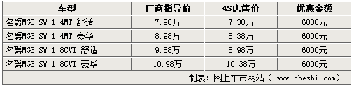 時值銷售旺季,各廠商紛紛拿出看家本領(lǐng)提高銷量。網(wǎng)上車市網(wǎng)站由經(jīng)銷商處了解到,現(xiàn)在到店購買MG3 SW系列車型僅優(yōu)惠6000元,相比前一段時間的萬元優(yōu)惠有大幅度的縮水。具體詳情如下: