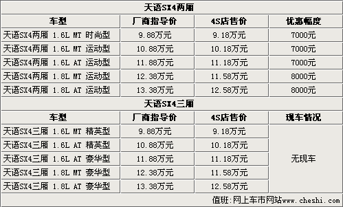 據(jù)長(zhǎng)安鈴木4S店銷(xiāo)售人員介紹,全新天語(yǔ)SX4系列只有兩廂車(chē)型有現(xiàn)車(chē)銷(xiāo)售,三廂天語(yǔ)SX4則沒(méi)有現(xiàn)車(chē)。而兩廂天語(yǔ)SX4 1.6L車(chē)型目前最高可以優(yōu)惠7000元,1.8L車(chē)型最高可以優(yōu)惠8000元。另外,購(gòu)買(mǎi)天語(yǔ)SX4 1.8L車(chē)型,還可以獲贈(zèng)廠家所提供的半價(jià)購(gòu)置稅優(yōu)惠。天語(yǔ)SX4三廂與兩廂車(chē)型的優(yōu)惠幅度一樣,但沒(méi)有現(xiàn)車(chē)銷(xiāo)售,只接受消費(fèi)者預(yù)訂。