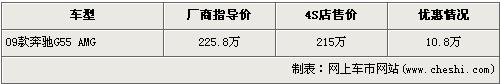 根據(jù)北京奔馳4S店銷售人員介紹,奔馳G55 AMG近期有10.8萬元的優(yōu)惠,經(jīng)優(yōu)惠09款奔馳G55 AMG的售價從225.8萬元下降到了215萬元,F(xiàn)車方面,店內(nèi)目前還有一輛黑色現(xiàn)車,錯過此車的消費(fèi)者需交10萬元訂金,約等半年后才可提車。
