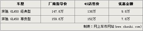 據(jù)經(jīng)銷商處銷售人員介紹,目前國內(nèi)在售的奔馳GL級分為GL450 經(jīng)典版與GL450 尊貴版,近日奔馳GL系的最高優(yōu)惠9.8萬元。經(jīng)9.8萬元優(yōu)惠后,低配的GL450經(jīng)典版售價(jià)降到了138萬元。高配的尊貴版經(jīng)7.8萬元優(yōu)惠后,售價(jià)從159.8萬元降到了152萬元。