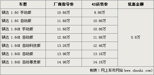 據(jù)東風(fēng)日產(chǎn)4s店銷售人員介紹,目前東風(fēng)日產(chǎn)騏達(dá)全系優(yōu)惠9000元。經(jīng)優(yōu)惠后,入門級的1.6G手動版售價下降到了9.88萬元,而全系最高配的1.6 GS自動尊貴版售價也降到了14.18萬元。銷售人員還介紹,目前店內(nèi)沒有騏達(dá)現(xiàn)車,欲購買者需交2000元訂金約等1個月時間。