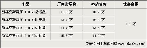 據(jù)長安福特經(jīng)銷商處銷售人員介紹,目前購買兩廂福克斯的消費者可以得到1.1萬元的優(yōu)惠。兩廂新款?怂狗譃1.8L和2.0L兩種排量,入門級車型的1.8L手動舒適版經(jīng)優(yōu)惠后售價下降到了10.79萬元。而高配的2.0L自動運動版售價同樣也降到了14.29萬元。