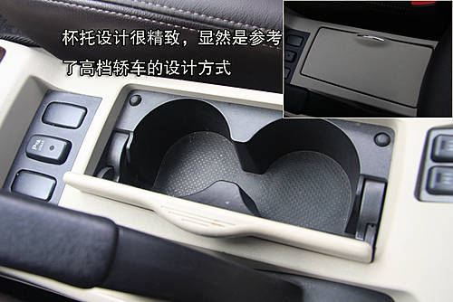杯托的制造工藝借鑒了高檔轎車杯托的設計,一個可以折疊的杯托蓋改善了視覺效果。
