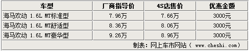 在市場中銷售有段時(shí)間的1.6L歡動(dòng)新車,現(xiàn)已進(jìn)入各個(gè)海馬經(jīng)銷商展廳,現(xiàn)車充足顏色齊全。在售的三款新車均為手動(dòng)版車型。除直接享受國家1.6L車型的購置稅優(yōu)惠政策外,并有現(xiàn)金3千元優(yōu)惠;銷售人員表示,現(xiàn)金優(yōu)惠也可換為等值的裝飾禮包,同樣超值,F(xiàn)金優(yōu)惠配合購置稅優(yōu)惠,則大大減輕了消費(fèi)者的購車負(fù)擔(dān)。
