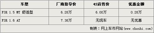 據(jù)比亞迪汽車北京地區(qū)4S店銷售人員介紹,目前北京在售的比亞迪F3R只有1.5L手動舒適版車型,并且廠商指導(dǎo)價(jià)也從6.08萬元回升到了6.28萬元。目前購買此車的消費(fèi)者可以得到2800元的優(yōu)惠,經(jīng)優(yōu)惠后售價(jià)降到了6萬元。