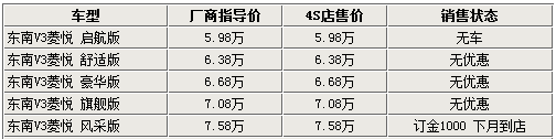 據(jù)東南經(jīng)銷商處銷售人員介紹,目前V3菱悅?cè)惮F(xiàn)車正在逐步充足貨源,最低配的車型仍因尚未投產(chǎn)而無(wú)法購(gòu)買,請(qǐng)消費(fèi)者諒解。V3系列其它的幾款高配車型各店仍需要預(yù)訂,暫時(shí)無(wú)法滿足消費(fèi)者購(gòu)車即提車的需要。同時(shí)銷售人員還說,現(xiàn)在購(gòu)車沒有任何形式的現(xiàn)金優(yōu)惠,僅有精美的裝飾贈(zèng)送。而即將上市的V3菱悅風(fēng)采版則需在訂車后等待一個(gè)月的時(shí)間才可提車,訂金為1000元。