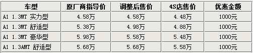 上個月中旬,奇瑞09款A(yù)1宣布在現(xiàn)有車型的基礎(chǔ)上增加了實力型和AMT兩種新車型,同時舒適型和豪華型官方降價4000元,售價已進入五萬元以內(nèi)。網(wǎng)站近日了解到,各家4S店內(nèi)的新車價格有所變化,全系車型均可小幅優(yōu)惠1000元。詳情如下: