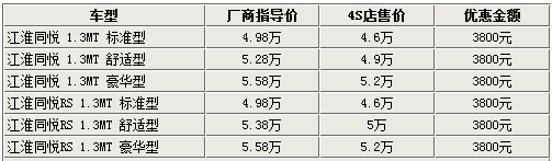 江淮的同悅及同悅RS系列車型,自上市后就吸引了眾多消費者關注。在三廂車型銷售很長時間之后,兩廂的RS版終于進入了北京市場開始銷售。網(wǎng)站由江淮轎車經(jīng)銷商處了解到,現(xiàn)在RS版以及三廂同悅車型店內(nèi)現(xiàn)車充足,購車最高可有3800元的現(xiàn)金優(yōu)惠。具體詳情如下: