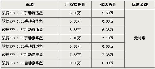 駿捷FRV是中華汽車首款兩廂車型,排量分為1.6L和1.3L,兩種排量車型分別在去年5月份和7月份上市。近期,駿捷FRV的車型再次得到了豐富,1.5L車型已經(jīng)進入各家中華經(jīng)銷店并開始售賣,駿捷FRV全系的售價區(qū)間為5.58萬元-8.38萬元。根據(jù)我們價格系統(tǒng)監(jiān)測顯示,駿捷FRV全系取消了現(xiàn)金優(yōu)惠,具體詳情請看下表: