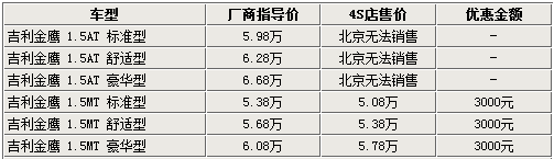 據(jù)北京地區(qū)吉利4S店銷售人員表示,吉利金鷹目前只有1.5L手動(dòng)車型有現(xiàn)車銷售,自動(dòng)版車型則沒(méi)有現(xiàn)車,并且不接受預(yù)訂,具體到店時(shí)間目前還不得而知。不過(guò),現(xiàn)在購(gòu)買吉利金鷹手動(dòng)版車型,全系都可以優(yōu)惠3000元。