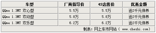 奇瑞在推出QQ家族的新成員QQme后,令經(jīng)典的QQ全系車型再度引起消費(fèi)者的關(guān)注。近日網(wǎng)上車市車市網(wǎng)站由經(jīng)銷商處了解到,新上市不久的QQme雖然沒(méi)有現(xiàn)金優(yōu)惠,但是贈(zèng)送價(jià)值2000元的保養(yǎng)卡。