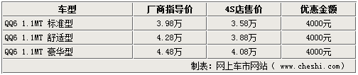 據奇瑞QQ6專營店銷售人員介紹,奇瑞QQ6系列車型比較齊全,目前全系都有一定的優(yōu)惠幅度,除現車較少的車型需要提前預訂以外,全系車型均可以優(yōu)惠4000元。