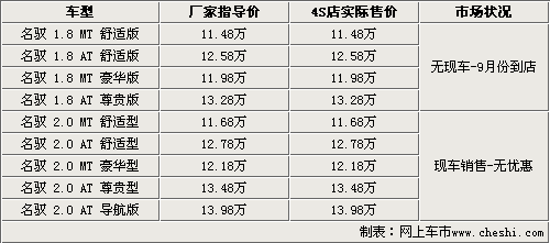 據(jù)北京地區(qū)現(xiàn)代4S店銷售人員表示,現(xiàn)在各4S店內均有MOINCA名馭2.0L現(xiàn)車銷售,由于是剛剛上市的新車,所以在價格方面沒有任何優(yōu)惠。至于1.8L車型,銷售人員則表示,1.8L車型要到9月份才能到店,目前接受現(xiàn)金預定。銷售人員還表示,1.8L的MOINCA名馭將主要面對出租車市場,所以客戶需要等待較長一段時間。