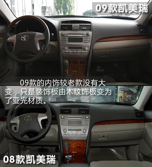 與外形只是細節(jié)小改相同,09款凱美瑞的內飾也沒有給我們帶來太多新意。大面積的亞光飾板取代了原先的木紋裝飾,顯得更有檔次——避免再被人指責為塑料感強烈的尷尬。
