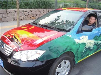 “前機(jī)蓋是巨幅的天安門城樓,車身兩側(cè)是鳥巢和長(zhǎng)城,在車的頂上,則是60年大慶的圖標(biāo)!睘橄驀(guó)慶獻(xiàn)禮,家住天安門附近的林先生和朋友一起在自己的愛車上做了一系列的彩繪,表達(dá)對(duì)祖國(guó)的祝福。
