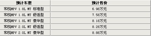 依照江淮汽車的定價規(guī)則,和悅MPV很有可能采用同悅的定價特點,預(yù)計會推出1.8L、2.0L兩個排量共計五款車型。另外,和悅MPV的入門級車型很有可能會定下較低的價格,使該系列產(chǎn)品擁有一個低價的宣傳策略,往往這種入門級低配車型很難銷售,或者是根本無車銷售。從同悅的配置價格差異來看,和悅MPV的價格區(qū)間應(yīng)該會定在6.98-8.88萬元左右。除了6.98萬元的入門級車型,和悅MPV同排量的舒適型和豪華型價格相差6000元左右,而同配置不同排量的兩款車的價格差應(yīng)該在7000元左右。