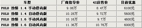 據(jù)4S店銷售人員介紹:目前POLO勁情全系僅為4款車型。之前的1.4升手動擋兩款車型合并為1.4手動舒尚版,1.4升自動擋兩款車同樣合為1.4自動舒尚版。其余1.6升兩款車型不變。目前全系最高優(yōu)惠6100元,其余三款車優(yōu)惠幅度都有所不同。目前全系現(xiàn)車非常少,預(yù)定需等1個月時間,如預(yù)定黑色和白色需等2個月以上,建議購買銀色、紅色、藍色車款。