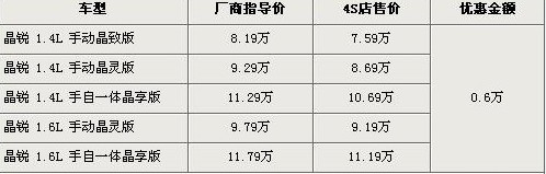 據(jù)4S店銷售人員介紹:目前晶銳全系優(yōu)惠6000元,最低僅售7.59萬。晶銳目前現(xiàn)車較為充足,顏色比較齊全,個(gè)別車型無現(xiàn)車。如需要預(yù)訂車輛,最短需等1個(gè)半月,最長需等2個(gè)月時(shí)間。價(jià)格方面,如到店內(nèi)洽談可獲得更高優(yōu)惠。為了慶!皣鴳c六十周年”,在店內(nèi)購車可選擇送購置稅或送保險(xiǎn)加精品裝飾或直接優(yōu)惠現(xiàn)金,選擇余地較多,消費(fèi)者可根據(jù)自身實(shí)際情況購車。