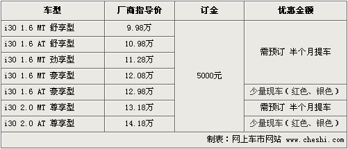 據北京現(xiàn)代北京地區(qū)4S店銷售人員介紹,現(xiàn)代i30因上市不久,新車貨源比較緊張,但現(xiàn)在已有少量1.6及2.0頂配車型現(xiàn)車到店,顏色以紅色、銀色為主。其余車型預訂最快半個月可提車,訂金為5000元。北京地區(qū)各4S店由于訂單不同,各店銷售的現(xiàn)車顏色有所不同。