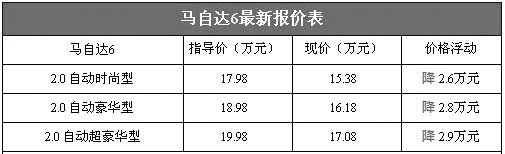 馬自達(dá)6是一款非常經(jīng)典的車型,現(xiàn)在更是憑借著突出的性價比持續(xù)熱銷。昨日,我們從北京地區(qū)的一些一汽馬自達(dá)汽車綜合經(jīng)銷商處了解到,近期馬自達(dá)6的價格穩(wěn)定,降幅在2.8萬元左右,其中馬自達(dá)6 2.0自動時尚型目前的售價為15.38萬元,性價比非常不錯。以下是馬自達(dá)6最新詳細(xì)報價表: