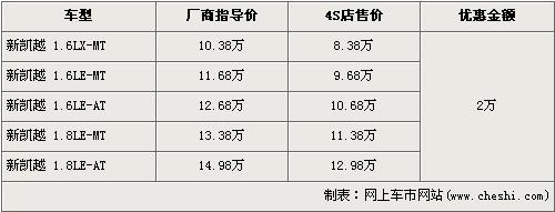 據(jù)4S店銷售人員介紹,新凱越分為1.6L與1.8L兩種排量車型,目前新凱越全系優(yōu)惠2萬元,較上個(gè)月的優(yōu)惠降幅有所下降。經(jīng)優(yōu)惠后,全系最低配的1.6LX-MT車型售價(jià)下降到了8.38萬元。經(jīng)優(yōu)惠后,1.8L手動(dòng)和自動(dòng)兩款車型售價(jià)也下降到了11.38萬元和12.98萬元。銷售人員還介紹,目前店內(nèi)現(xiàn)車齊全,是消費(fèi)者挑選的較好時(shí)機(jī)。