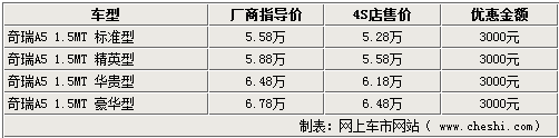 據(jù)奇瑞4S店銷售人員介紹,目前各點(diǎn)內(nèi)均主要銷售1.5升的A5車型,老款的A516已經(jīng)停產(chǎn),4S店都已經(jīng)沒(méi)有庫(kù)存車銷售,未來(lái)也不會(huì)再投產(chǎn)進(jìn)行銷售。目前奇瑞A515精英型等車型在店里都有現(xiàn)車銷售,為迎接國(guó)慶以及中秋雙節(jié)的來(lái)臨,現(xiàn)在購(gòu)A5全系均可享受3000元的優(yōu)惠。
