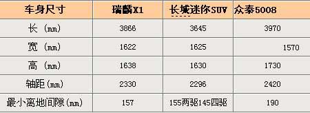 瑞麒X1定位于奇瑞首款微型SUV產(chǎn)品,長寬高分別達到3866×1622×1638mm,軸距也達到了2330mm。體積在三車中低于眾泰5008,但高于長城迷你SUV。