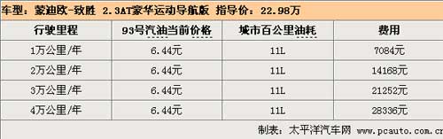 致勝的2.3L發(fā)動機的最大功率為118Kw/6500轉,最大扭矩為205Nm/4000轉。這與馬自達6 2.3L的數(shù)據(jù)相差并不是太多,估計新蒙迪歐致勝的動力系統(tǒng)還是來自于馬自達6。 蒙迪歐致勝2.3自動版的百公里油耗成績?yōu)?1L,每行駛1萬公里需要費用為7084元。