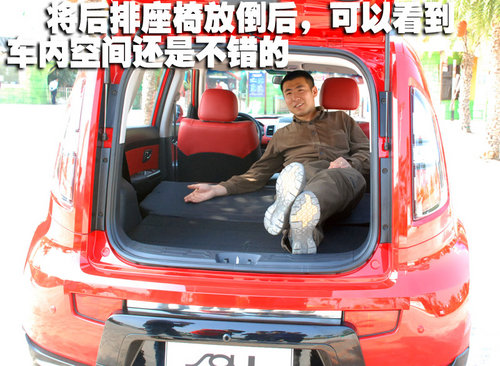 后排座椅可以全部放倒或是4/6比例分割放倒,這里面的空間足夠容納兩個人或是一臺大洗衣機或是電視了,買來SOUL用來搬家也許不是最好的主意,不過一旦有需求SOUL真的可以滿足儲物的需要了。后排座椅在乘坐三名乘員的時候顯得比較緊湊,畢竟這還只是一臺A0級的小車而已,所以對于空間我們也不應(yīng)有太多的奢求。