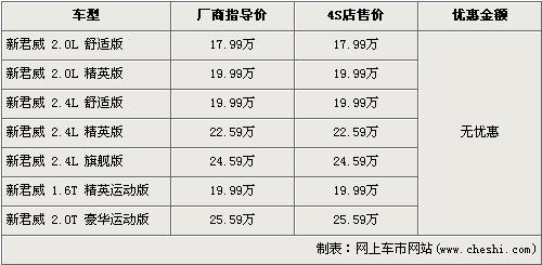 根據(jù)北京別克經(jīng)銷店銷售人員介紹,自別克新君威1.6T上市后,目前別克新君威全系共有7款車在售,售價區(qū)間為17.99萬元-25.59萬元。銷售人員還介紹,店內(nèi)已經(jīng)有新君威1.6T的現(xiàn)車,顏色以紅色和藍(lán)色為主,其他車型的現(xiàn)車也比較充足。如果預(yù)訂店內(nèi)沒有顏色的車型,需交訂金為1千元,下個月可提現(xiàn)車。