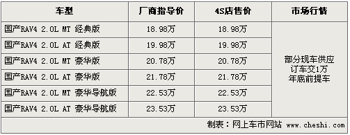 據(jù)一汽豐田北京地區(qū)4S店銷售人員介紹,目前該車有部分車型少量現(xiàn)車,由于RAV4貨源比較緊張,大部分車型及顏色消需要提前預(yù)定,訂車需要等待2個月的時間,也就是要到年底前才可以提到現(xiàn)車。如果著急購買,需加價現(xiàn)金一萬元或在4S店購買等值的裝飾。現(xiàn)車顏色以黑色、白色、銀色為主。北京地區(qū)各4S店由于訂單不同,各店銷售的現(xiàn)車顏色有所不同。