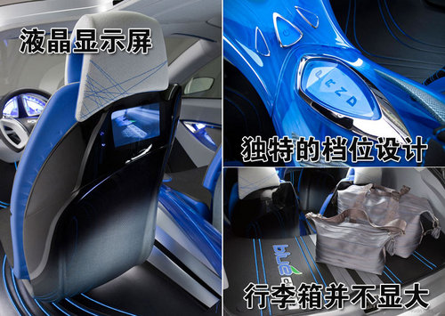 內(nèi)飾方面大量采用了藍(lán)色光,車內(nèi)檔位部分采用了類似盾形的設(shè)計(jì),風(fēng)格大膽,超乎人的想象。在駕駛座后排還安裝有液晶顯示屏幕,同時(shí)時(shí)尚的行李箱也透出新穎的概念設(shè)計(jì)。