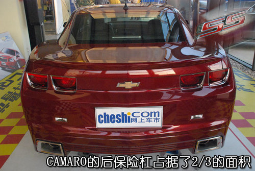 轉(zhuǎn)到車尾,Camaro的尾部雖然非常飽滿,但是有棱有角的“飛鏢式”造型始終是貫穿全車。后保險杠造型極其夸張,巨大的后保險杠整整占據(jù)了車尾2/3的面積,如果行駛在道路上不知道后車看見如此震撼的車尾還有沒有膽量踩下油門。