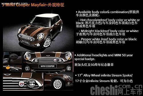MINI 50 Mayfair紀念版車型在配置上較MINI Cooper 1.6高配車型有所提升,運動真皮方向盤、電動折疊外后視鏡、發(fā)動機艙蓋褐色飾條、倒車雷達及自動大燈控制等均稱為MINI 50 Mayfair紀念版車型標準配置。