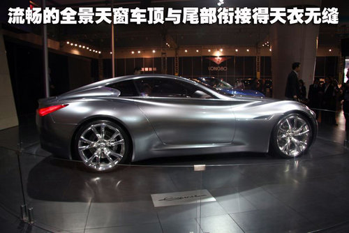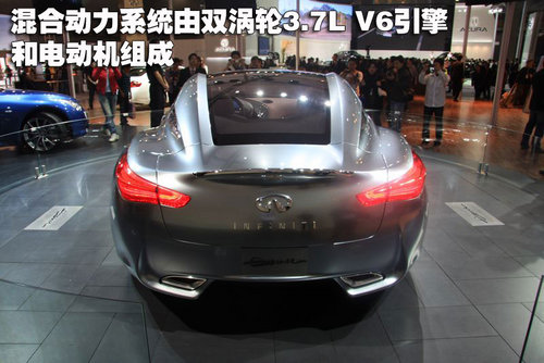 圍著這輛英菲尼迪斥巨資打造的GT跑車轉上一圈,你會驚嘆它是如此的低矮,如此的修長。環(huán)繞整個車身的腰線,華麗的曲面,將流暢的全景天窗車頂與尾部銜接得天衣無縫。 它那長得有些夸張的引擎蓋,完全是為了承載一部動力強勁到足以與法拉利Scuderia叫板的混合動力系統(tǒng)。一臺標準的3.7升V6自然吸氣汽油機,加裝了雙渦輪,最大功率躥升至324千瓦。當并聯(lián)的混合動力系統(tǒng)滿負荷工作時,Essence概念車可以獲得442千瓦的驚人動力。