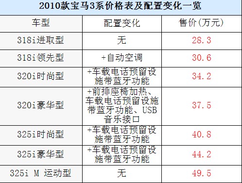 和奧迪A4L比起來,2010款寶馬3系的變化還是很值得表揚(yáng)的,除去沒有任何變化的最低配和最高配車型之外,其他車型都增加了一些實(shí)用的配置,而價(jià)格卻沒有任何變化。