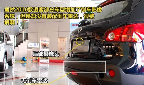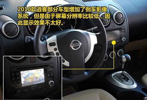 新的逍客在外觀上沒有任何變化,僅僅只在原來6款車身顏色的基礎(chǔ)上增加夢幻銀色。更多的變化出現(xiàn)在車輛內(nèi)部的配置上,部分車型增配了倒車影像系統(tǒng),但我們卻認(rèn)為這個(gè)并不實(shí)用,因?yàn)槠聊恢挥?.3英寸,也就是和一般車載導(dǎo)航儀的大小相當(dāng),而且分辨率比較低,所以顯示效果不好。令人費(fèi)解的還有,有了攝像頭之后,逍客卻沒有裝配倒車?yán)走_(dá),其實(shí)大家在倒車的時(shí)候,倒車影像只是作為參考,主要還是依靠倒車?yán)走_(dá)的聲音來判斷距離遠(yuǎn)近,所以沒有倒車?yán)走_(dá)很不方便。