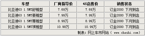 10月26日,比亞迪汽車首款中級(jí)車型G3正式在國(guó)內(nèi)上市,售價(jià)7.69-10.99萬(wàn)元。比亞迪G3是比亞迪汽車A3銷售網(wǎng)絡(luò)和G系產(chǎn)品的首款車型,標(biāo)志著比亞迪汽車開啟了全新的產(chǎn)品時(shí)代,走向高端化發(fā)展路線。網(wǎng)上車市網(wǎng)站了解到,目前比亞迪各家經(jīng)銷商處還沒(méi)有G3現(xiàn)車銷售,僅提供預(yù)訂,訂金2000元,最快將在下個(gè)月到店。詳情如下: