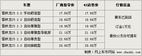 據(jù)東風(fēng)雪鐵龍4S店銷售人員介紹,C5目前已開始接受預(yù)訂,訂金為1萬元,目前陸續(xù)已有客戶開始訂車,最快12月份可以提到現(xiàn)車。C5的展車現(xiàn)已到店,對這款車感興趣的朋友不妨親身去體驗一下。